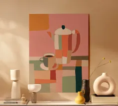 A minimalist still life capturing a quiet moment of warmth and care. Soft brushstrokes and layered hues of peach, coral, and gentle green surround a simple striped cup, evoking calm, presence, and tenderness. This artwork reflects a pause in time — a small, comforting ritual held with intention. Ideal for modern, Scandinavian, or cozy contemporary interiors.