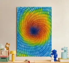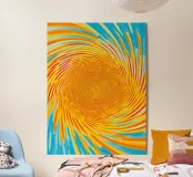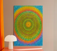 A mesmerising masterpiece of op art: the radiant yellow spiral of the sun swirls dynamically on bright turquoise blue - a perfect fusion of sun, sky and sea. The precise, rhythmic lines are reminiscent of Vasarely and Bridget Riley, while the intense colour palette reveals pop art influences. The optical illusion creates a fascinating depth effect and magically draws the viewer into the centre. This energetic work of art lends any room a positive, optimistic, summery atmosphere and remains in the memory for a long time.