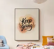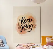 A gentle push to stay on track. This motivational wall print features the words “Keep Going” in a bold hand-lettered style, set against a soft watercolor splash with botanical accents — perfect for daily inspiration in any space.