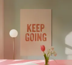 The "Keep Going" design combines clear typography with a minimalist layout and inspires perseverance and positive energy. The lettering in bold red tones sets a strong accent and makes the design a modern statement for creative and determined spaces.