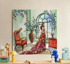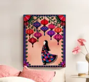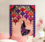 A woman in a colorful dress stands under a canopy of hanging lanterns in shades of red and purple. The glowing ambiance casts a dreamy, whimsical glow throughout the painting.