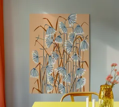 This piece is about release. White blossoms move freely across a calm blue field, untethered, light, unforced. There’s no rush here — only rhythm, breath, and space. It’s the kind of artwork that quiets a room without disappearing into it, inviting the eye to slow down and the mind to loosen its grip.