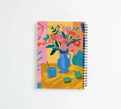 A modern still life of a bouquet of pink and orange flowers in a blue vase. Two green limes sit on the table, adding a fresh, zesty twist to this vibrant and colorful composition.