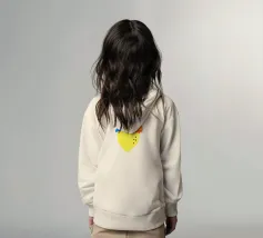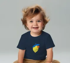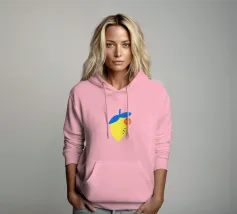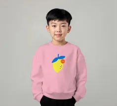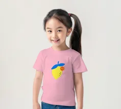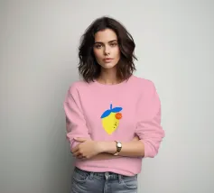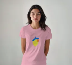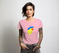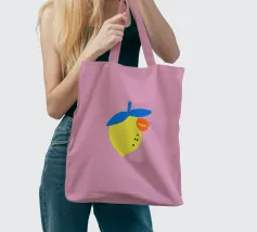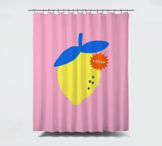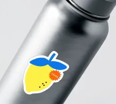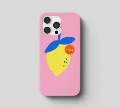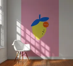 Grafische Zitrone in Gelb auf pinkem Hintergrund mit Obst-Sticker Detail.
