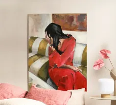 A minimalist lifestyle portrait capturing a quiet moment of reflection. Warm reds and soft peach tones contrast with cool shadows, framing a seated figure turned inward. Expressive brushstrokes suggest thoughtfulness, pause, and emotional depth — a moment of listening to oneself. This artwork brings warmth and introspective calm to modern, Scandinavian, or thoughtfully curated interiors.