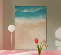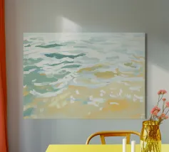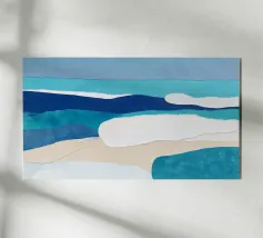 A contemporary abstract collage capturing the textured beauty of the shoreline. Layers of torn paper mimic the rhythmic meeting of sea, surf, and sand, evoking the calm yet dynamic energy of the coast.