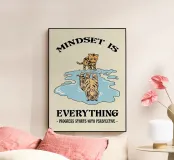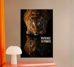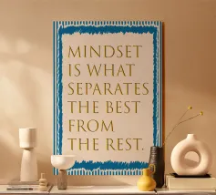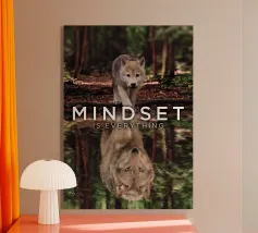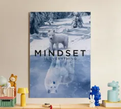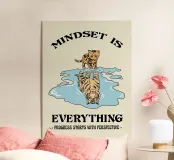 This motivational artwork features a small kitten gazing into a puddle, where its reflection shows a powerful tiger. With the inspiring quote “Mindset is Everything – Progress Starts with Perspective,” it symbolizes confidence, self-belief, and growth. A perfect reminder that perspective shapes potential and dreams begin with mindset.