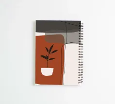 A minimalistic design features a simple potted plant with dark leaves set against abstract, overlapping shapes in earthy tones of red, gray, and white. The clean lines and bold color blocks create a modern, calming aesthetic.