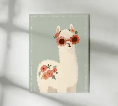 The motif shows a charming llama with red sunglasses, a blue headdress and a wreath of pink flowers. The delicate brushstrokes and soft pastel colours give the illustration a humorous yet elegant character. A playful work of art that combines joie de vivre and style with a twinkle in the eye.