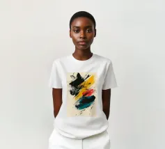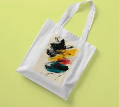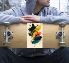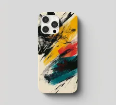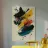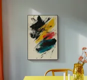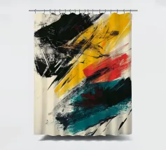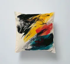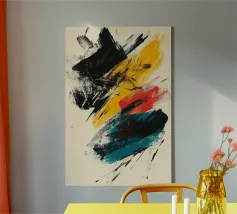 Dynamic abstract composition featuring textured brush strokes in bold black, vibrant yellow, striking red, and teal hues against a neutral beige background. The energetic brushwork creates a sense of movement and contemporary artistic expression.