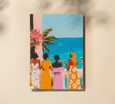 A group of women standing together, gazing out at the ocean. This artwork celebrates friendship, travel, and shared summer moments.