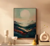This serene landscape painting captures the beauty of nature in a minimalist style. Soft, muted colors create a calming atmosphere, while the intricate details of the mountains and the water's edge invite contemplation. The large, luminous moon adds a touch of magic to the scene, making it perfect for any home or office space.