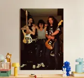 A vintage photo of three rock musicians posing with their instruments, showing a tough and rebellious style.