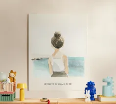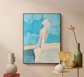 Bathed in liquid light, a lone swimmer lingers at the pool’s edge — her silhouette softened by watercolor’s gentle wash. Strength and serenity intertwine as she gazes into the blue, a quiet moment suspended between motion and memory, painted with breath and grace