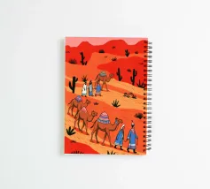 This painting illustrates a group of nomads with camels traversing a desert. The scene is set against a backdrop of red dunes and sparse vegetation, emphasizing the harsh yet beautiful environment.