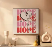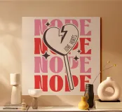 Bright, bold text and a heart-shaped lollipop convey a playful yet edgy message about love. The repeated word "NOPE" in pink and red adds emphasis to the theme.