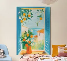 A view through a window of a beautiful orange tree, heavy with ripe fruit. The warm, sun drenched light and charming subject create a scene of rustic, Mediterranean abundance.