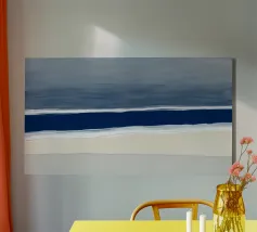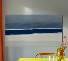 A minimalist seascape rendered in layered horizontal bands of indigo, slate, and ivory. The piece evokes the quiet stillness of sea meeting sky—balanced, meditative, and restrained—using broad, fluid brushwork and soft tonal gradation.