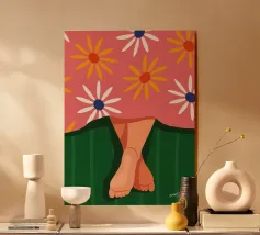 A whimsical illustration of legs adorned with striped pink socks and delicate blooming flowers. The background features playful black polka dots, adding a retro yet modern aesthetic. A fusion of fashion and nature, this artwork exudes charm and creativity.