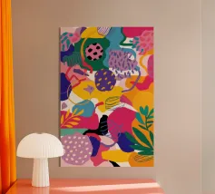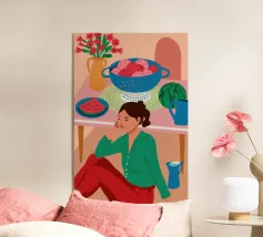 An abstract composition features a bowl of strawberries amidst a swirl of colorful, organic shapes and patterns, creating a fresh and modern interpretation of a summer classic.