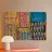 A patchwork of different patterns, including lines and U-shapes, in vibrant yellows, blues, pinks, and reds, creates a colorful mosaic effect in this abstract piece.