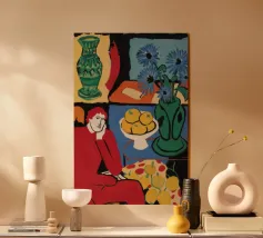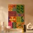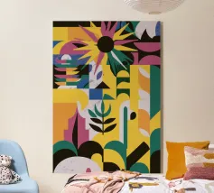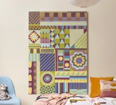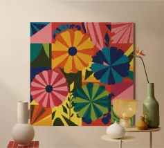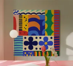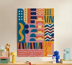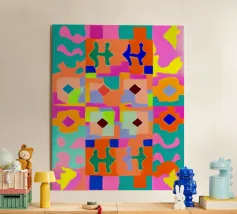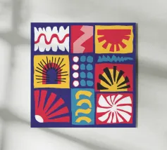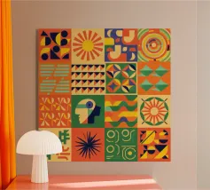 A bold and energetic abstract composition featuring a grid of colorful geometric patterns. The vibrant mix of shapes, from suns to checkerboards, creates a joyful and dynamic visual feast.