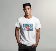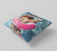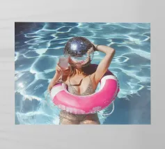 The picture captures a playful and surreal scene at a pool party. A woman swims in clear blue water wearing a shiny disco ball helmet that reflects the sunlight. She lies in a pink inflatable ring and holds a glass with a pink-coloured drink in her hand, adding to the festive atmosphere. Her swimming costume is glittery and matches the glamorous and fun mood of the scene. The water around her glistens and light patterns dance on its surface, adding to the lively and carefree mood of the image.
