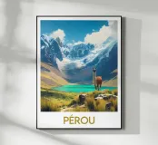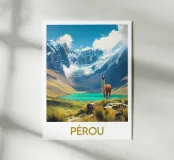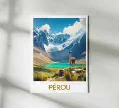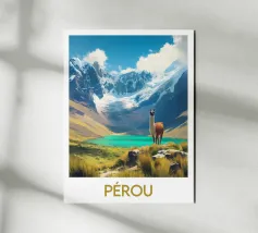 Poster from Peru, a breathtaking illustration showing a majestic llama in front of a turquoise lake and snow-capped mountains. Perfect for a natural and inspiring wall decoration.