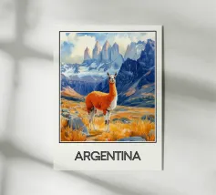 Affiche du Peru, une illustration majestueuse d’un lama solitaire devant un lac turquoise entouré de montagnes enneigées. Parfaite pour une décoration murale d’évasion et de nature grandiose.