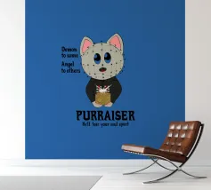 This playful design transforms the iconic Pinhead into a feline, the "Purraiser," holding the famous Lament Configuration and featuring the classic phrase: "Demon to some. Angel to others. Purraiser, he'll tear your soul apart." A humorous parody of the Hellraiser poster, where the dreaded leader of the Cenobites takes on a kitty form. Show your appreciation for the cutest and spookiest Cenobites with this unique design.