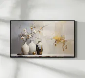 A quiet still life rises up between soft layers of grey and cream, like taking a deep breath. An arrangement with golden accents, reminiscent of quiet mornings, of moments when time expands and the world becomes quieter. This design celebrates the beauty of the unagitated: warm reflections, soft textures, quiet elegance. It speaks of harmony, inner peace and the power of small details to transform a home into a feeling.