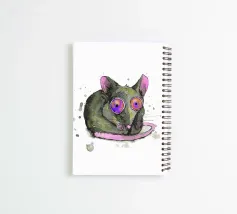 A spotty watercolor drawing of a black rat. Grunge dripping style. He has big purple eyes. He looks at you in bewilderment.