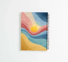 A vibrant abstract landscape inspired by retro color palettes and modern gouache textures. Flowing bands of warm yellows, coral reds, cool blues, and deep navy surround a glowing sun, creating a dynamic and uplifting visual effect. The textured, painterly finish adds depth and character, making this artwork perfect for wall décor, posters, prints, stationery, and contemporary interior design. The harmonious blend of colors evokes warmth, movement, and a nostalgic yet modern aesthetic.
