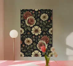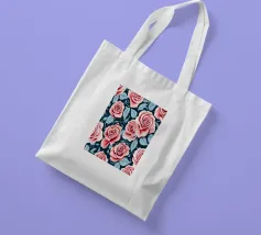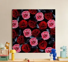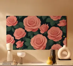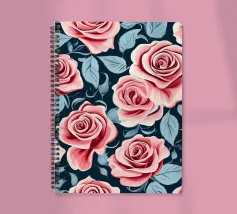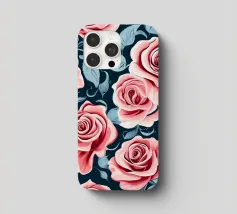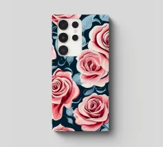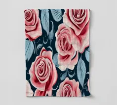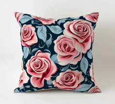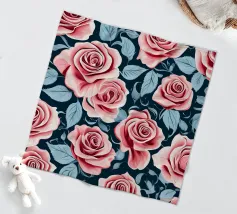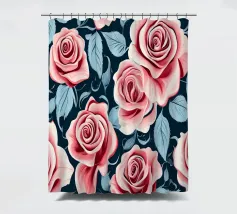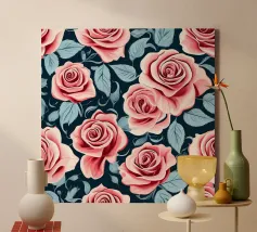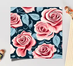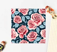 A captivating floral pattern featuring delicate pink roses and lush green leaves on a navy blue background. Perfect for adding a touch of elegance and romance to any space.