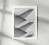 Black and white poster of minimalist architecture: zigzagging external staircase, attached to a light façade and cut by low-angled light that casts long graphic shadows. Clean lines, textured concrete and a repetitive rhythm create a hypnotic geometric image. An elegant wall poster for the living room, office or hallway, it brings relief, modernity and balance to contemporary, Scandinavian, industrial or Japandi decors.