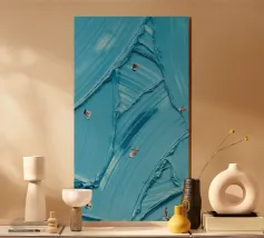 This artwork reveals an aerial view of skiers moving through sweeping, sculpted snow forms that resemble flowing currents. Thick, layered brushstrokes create a tactile surface, blurring the line between landscape and abstraction. The winding tracks guide the eye across the composition, while the small figures provide scale and a sense of quiet motion. The interplay of light, shadow, and texture transforms the winter slope into a visual meditation on movement, rhythm, and the transient traces left by human presence—ideal for contemporary spaces and large-format fine art prints.