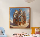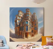A surreal architectural structure with curved and distorted features, blending classic and modern styles, stands under a bright blue sky. The cobblestone street and soft sunlight enhance the whimsical, dreamlike atmosphere.