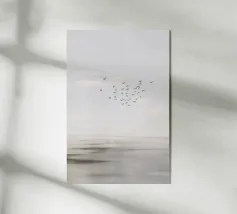 This calming coastal motif with a flock of seagulls flying elegantly over the sea captures the peaceful atmosphere of a secluded beach. The gentle waves and expansive horizon lend the image a deep calm that fits perfectly into modern living spaces. Whether as a wall mural, cushion or mug - this motif brings the beauty of nature into the home and invites you to dream. Perfect for anyone who longs for a relaxed, nature-loving aesthetic.