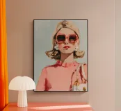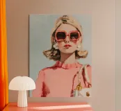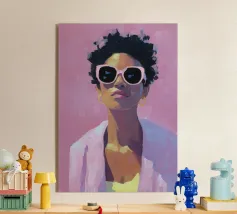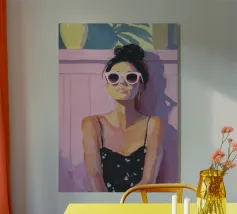 A stylish retro-inspired portrait of a confident woman basking in warm sunlight. Soft brushstrokes, muted pastels, and a timeless fashion aesthetic make this artwork a perfect statement piece for modern, eclectic, or mid-century inspired interiors.