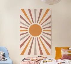 A vibrant burst of stylized sunshine painted in wide, textured stripes of warm yellows, coral pinks, and burnt orange. This minimalist artwork evokes the golden glow of a vintage summer morning, perfect for adding energy and retro charm to modern interiors.