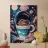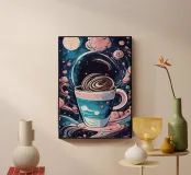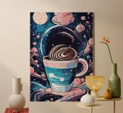 coffee cup cosmic theme galaxy swirls clouds moon stars night sky vortex steam outer space beverage whipped cream celestial patterns fantasy universe motif surreal scene astronomy elements floating objects dreamlike atmosphere