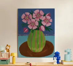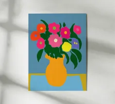 A bouquet of pink flowers in a terracotta vase sits on a patterned pink and black surface. The background is a block of vibrant turquoise, creating a playful and stylish composition that celebrates color and pattern.