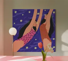 This design was inspired by a scene I saw at the sea; three tattooed brothers swimming with a large unicorn float.