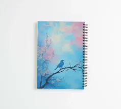 A blue bird sitting on the branch of a cherry blossom tree in front of a pastel-coloured sky with pale pink clouds. The background is a colour gradient from light to dark blue, creating a dreamy and serene atmosphere. This painting captures the beauty of the tranquillity and elegance of nature in the style of oil painting.