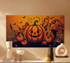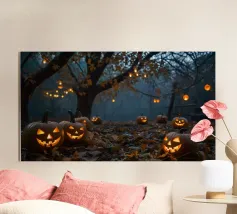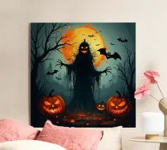 As twilight descends, a silhouetted witch is seen flying on her broomstick among the bats, with a glowing pumpkin in the foreground, creating an enchanting atmosphere.