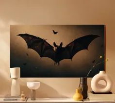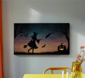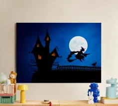 A silhouetted witch flying on a broomstick in a twilight bat acrylic glass