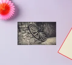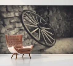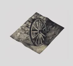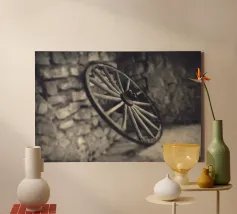 A shallow focus shot of an old spoked wooden waggon wheel in a stone barn in France.