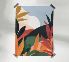 A modern abstract composition of various stylized botanical shapes and leaves in a palette of terracotta, beige, and dark blue against a light background.