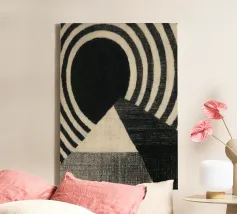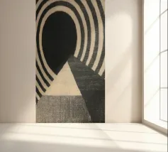 Abstract black and white design with concentric circles in grey and black. At the bottom is a triangle with a light beige centre. Grainy, woven texture creates depth and structure and makes the motif a modern, abstract eye-catcher.