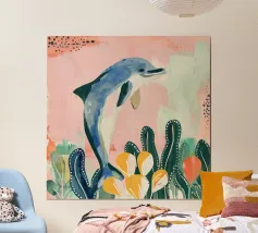 A simple view of a dolphin in warm pink and ochre tones, with a calm and balanced presence.